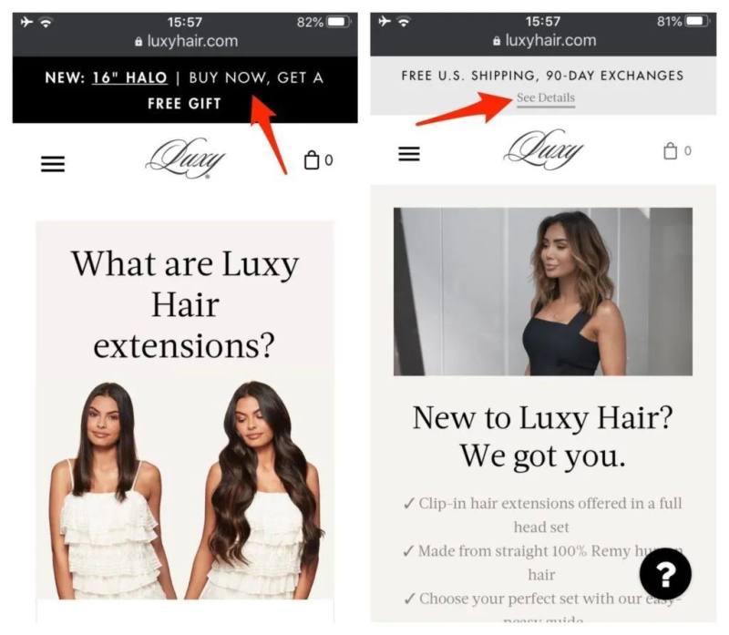 Luxy Hair的这个移动网站示例中,你可以看到两个带有号召性用语的横幅。第一个是推广新产品,附带免费礼品,第二个是提示用户了解更多关于该品牌免费送货和90天换货的政策。