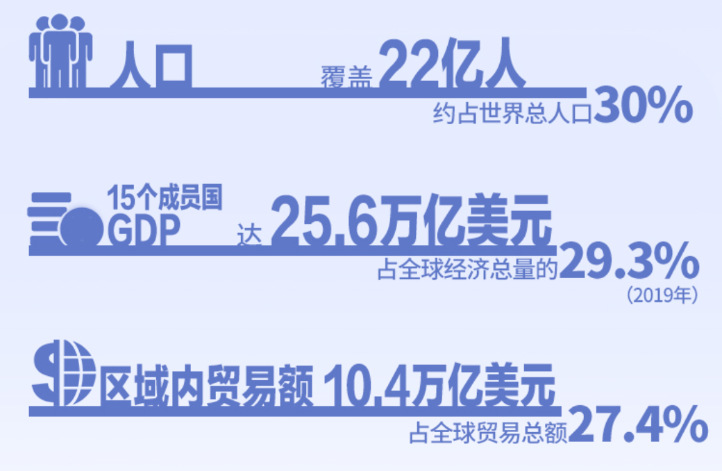 RCEP协定覆盖15个成员国,拥有22亿人口,约占世界总人口30%,25.6万亿美元的GDP,占全球经济总量的29.3%,10.4万亿美元的区域内贸易额,占全球贸易总额的27.4%。